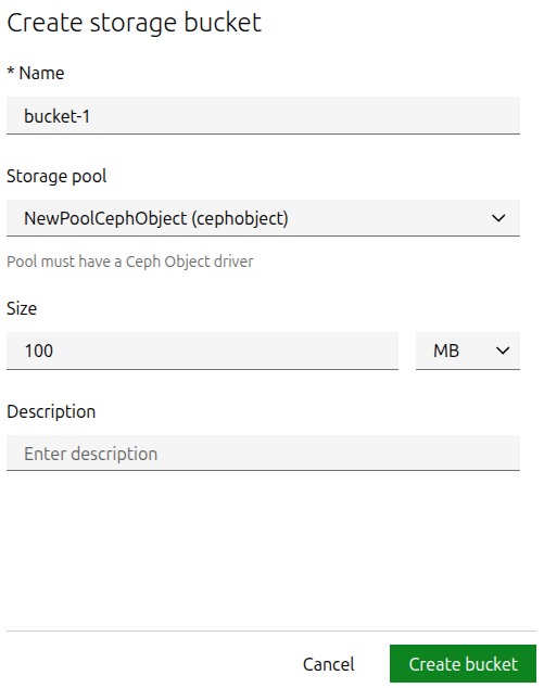 In the form that appears, set a unique name for the storage bucket and select a storage pool. You can optionally configure the bucket’s size and description.
