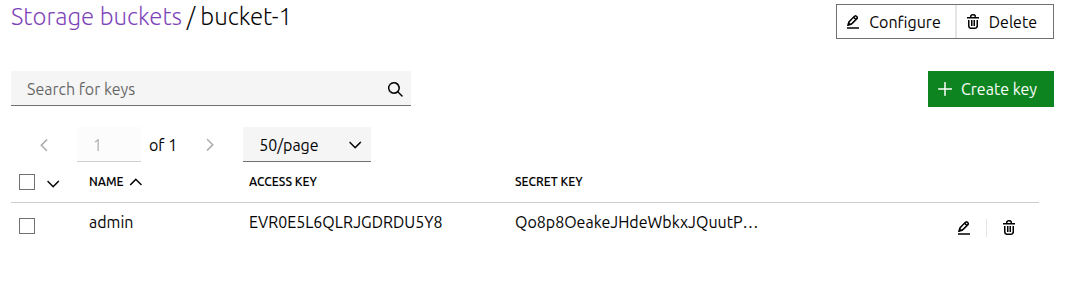 To edit or delete storage bucket keys, go to the key management page of the desired bucket.