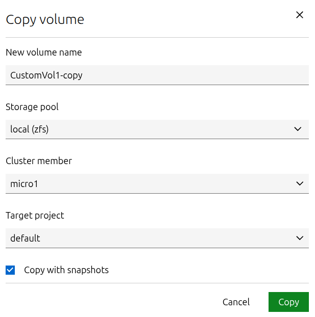 lxc storage volume copy <source_pool_name>/<source_volume_name> <target_pool_name>/<target_volume_name>