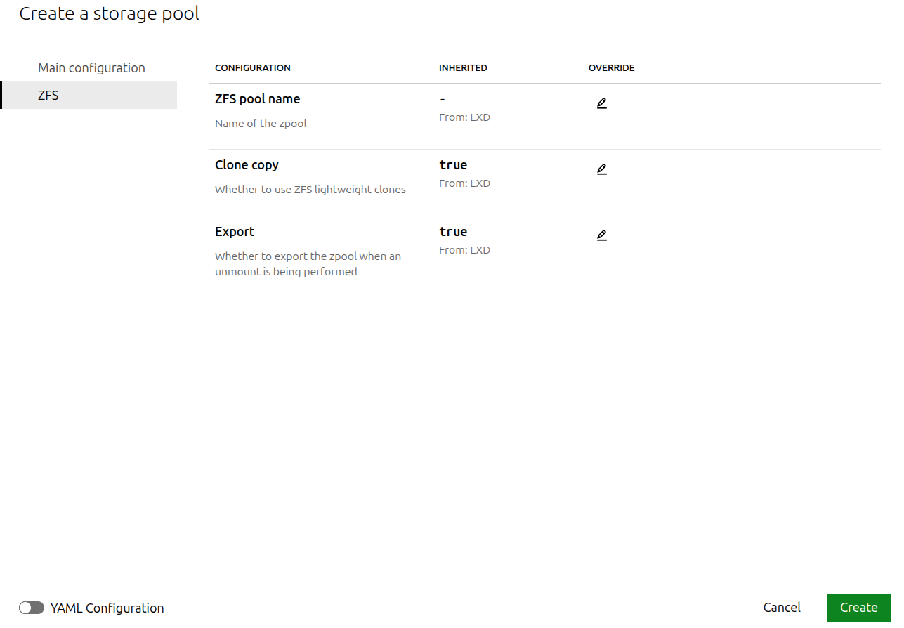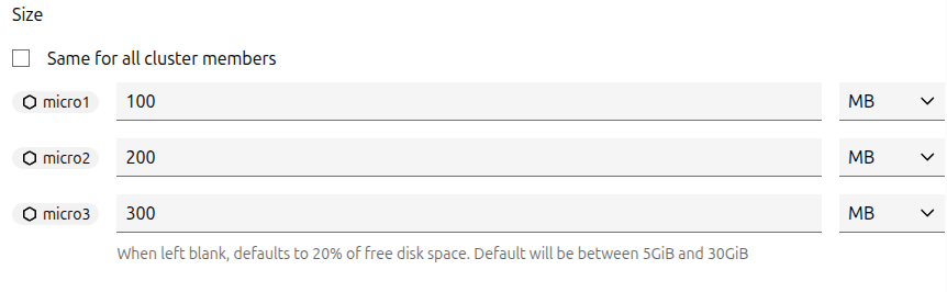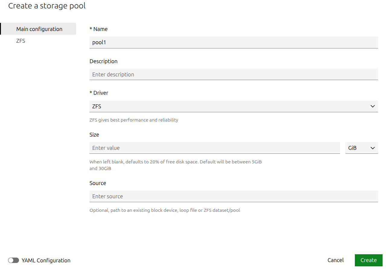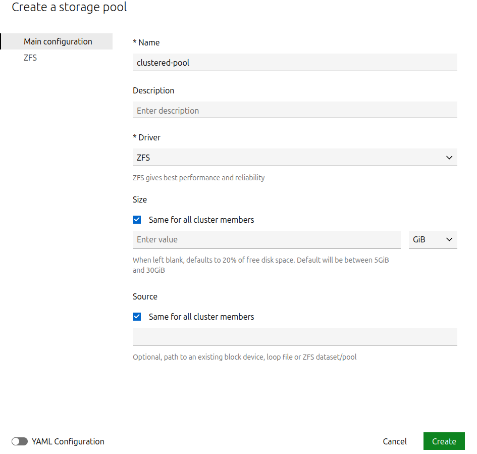 On the resulting page, configure the storage pool’s name and description. Depending on the selected driver, some settings can be configured per cluster member or applied globally to the cluster.